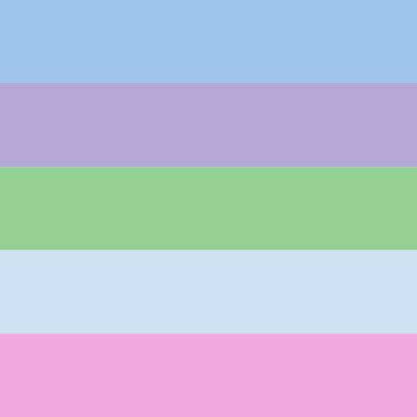There are a few flags floating around for the transneutral community. As of February 2024, the official flag is a 5 stripe flag created by the user UMEKOANGEL on reddit. The flag colors from top to bottom are: Cornflower Blue (#9fc5e9), Wistful Purple(#b4a7d5), De York Green (#95d193), Link Water Blue (#cfe2f3),Illusion Pink (#f2a9de). Color names taken from the site https://chir.ag/.